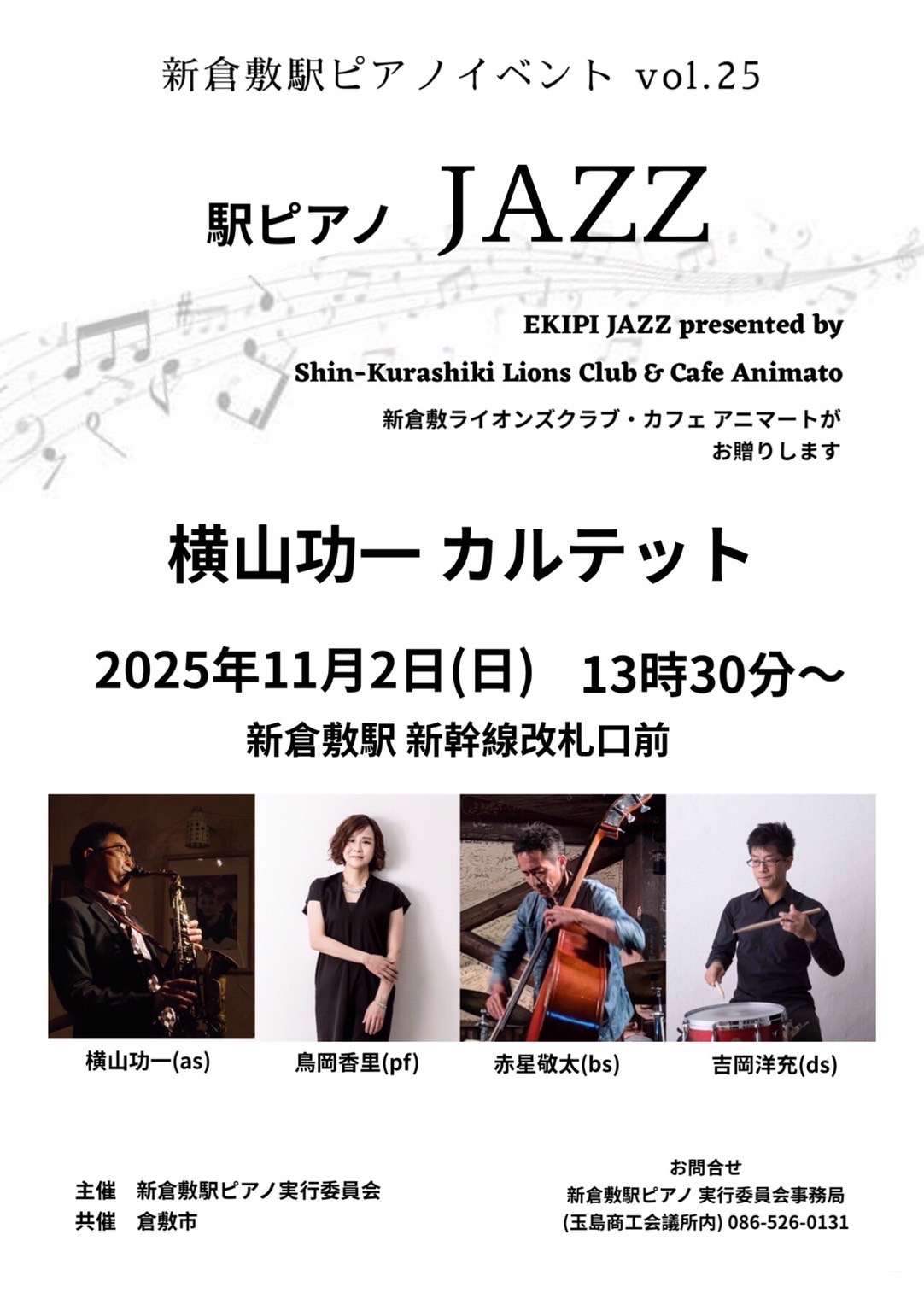 | 2025年11月2日(日) 駅ピアノJAZZ 〜横山功一カルテット〜 | ||