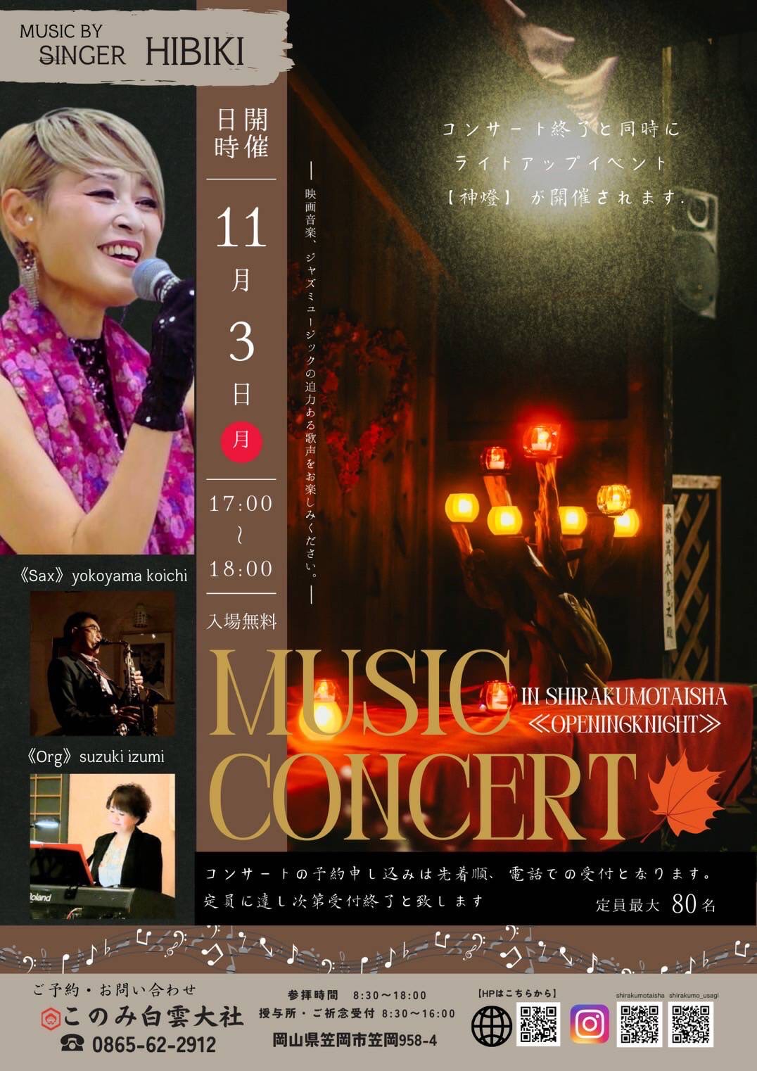 | 2025年11月3日(月) 響紀 ライブ -白雲大社 神燈 music concert- | ||
