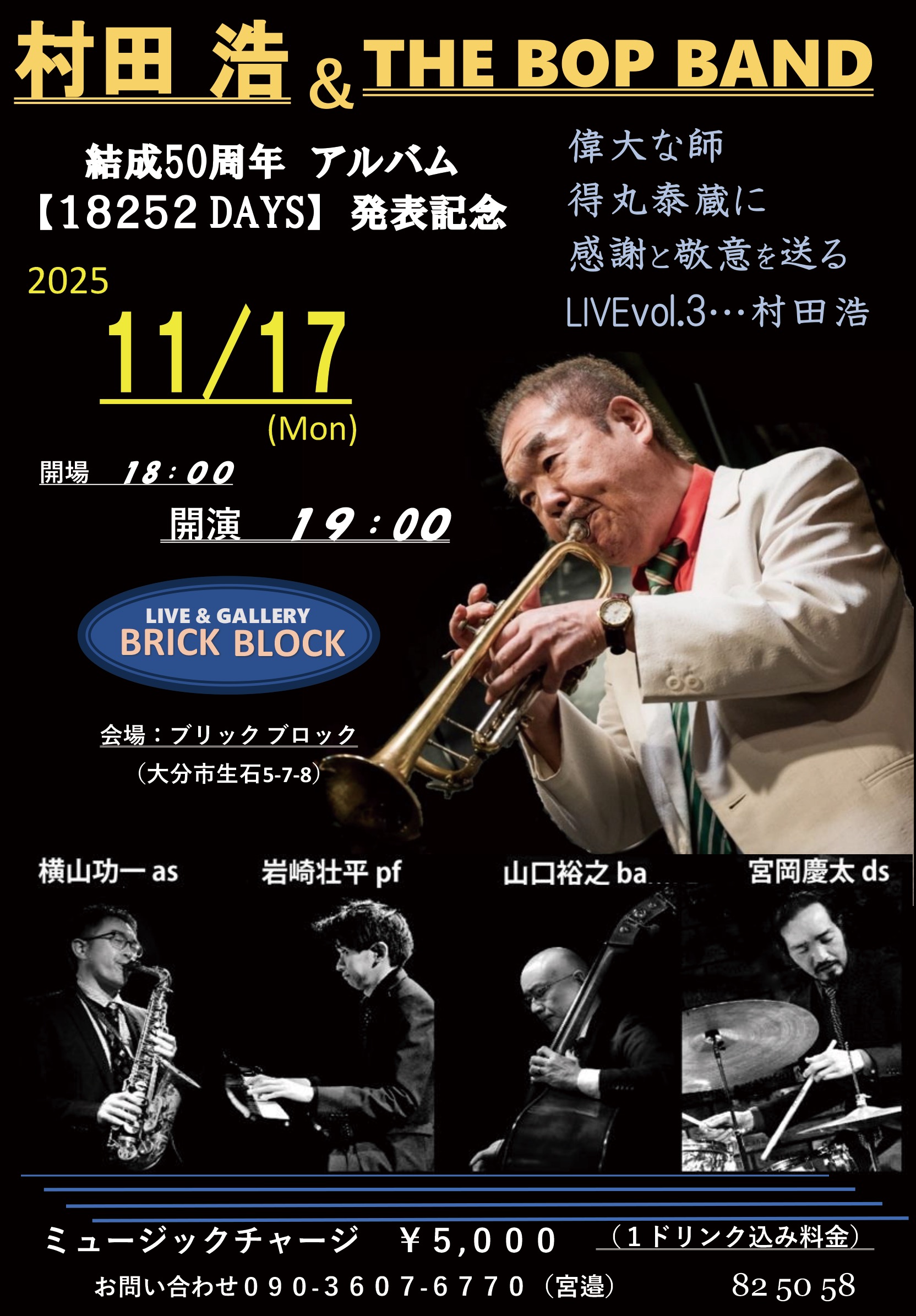 | 2025年11月20日(木) 村田浩&THE BOP BAND 2025年秋 〜18252 DAYS TOUR〜 | ||